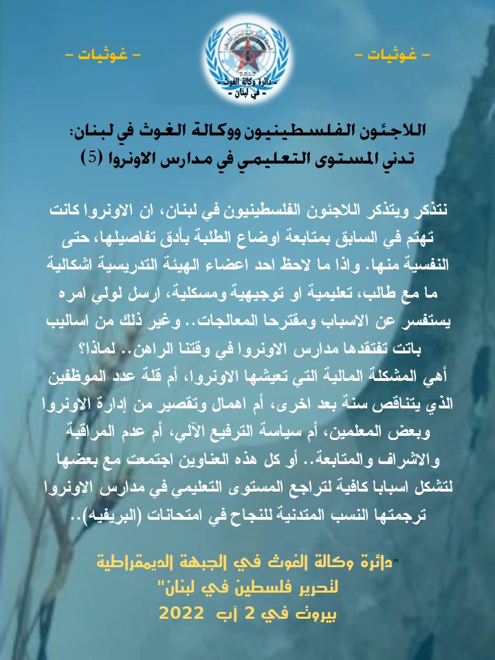 رغم نسبة النجاح المرتفعة في الشهادة الرسمية اللبنانية (البكالوريا الثانية بفروعها المختلفة)، إلا أن هذا لا يجب أن يحجب النظر عن متابعة خلل ومشكلة حصلت في نتائج الشهادة اللبنانية الرسمية (البريفية)، من زاوية بذل كل جهد ممكن من قبل الأونروا والهيئات التدريسية والأهل لضمان عدم تكرار ما حصل، ومراجعة الأسباب الفعلية لنسب النجاح المتدنية والمرتفعة في آن ..